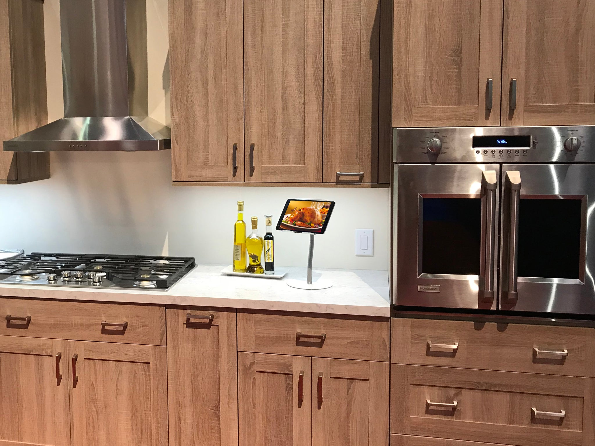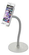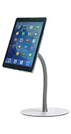 Specifications: SKU: FLX-TB2 GTIN: 854483007052 Overall Width x Depth: Base 8" Diameter, Bracket: 6.5" x 7" Overall Height Range x inches: 12" Weight: 1.75 lbs. Material: Base: Aluminum. Bracket: Aluminum with Silicone Coating. Gooseneck: Silicone Color: Gray Finish: Aluminum and Stainless Steel Placement Style: Counter, Tabletop, Desktop, Bedside Tables, Nightstand, Kitchen Orientation: Portrait, Landscape Features: Tilting, Adjustable Height, 1/4” - 20 standard camera adapter, Travels flat to 1” Compatible Devices: All 7" to 12" Tablets including: all Apple iPads, Android Tablets, Samsung Galaxy, Google Android & Pixelbook, Microsoft Surface, Amazon Kindle, and many others like Dell, HP and Lenova tablets