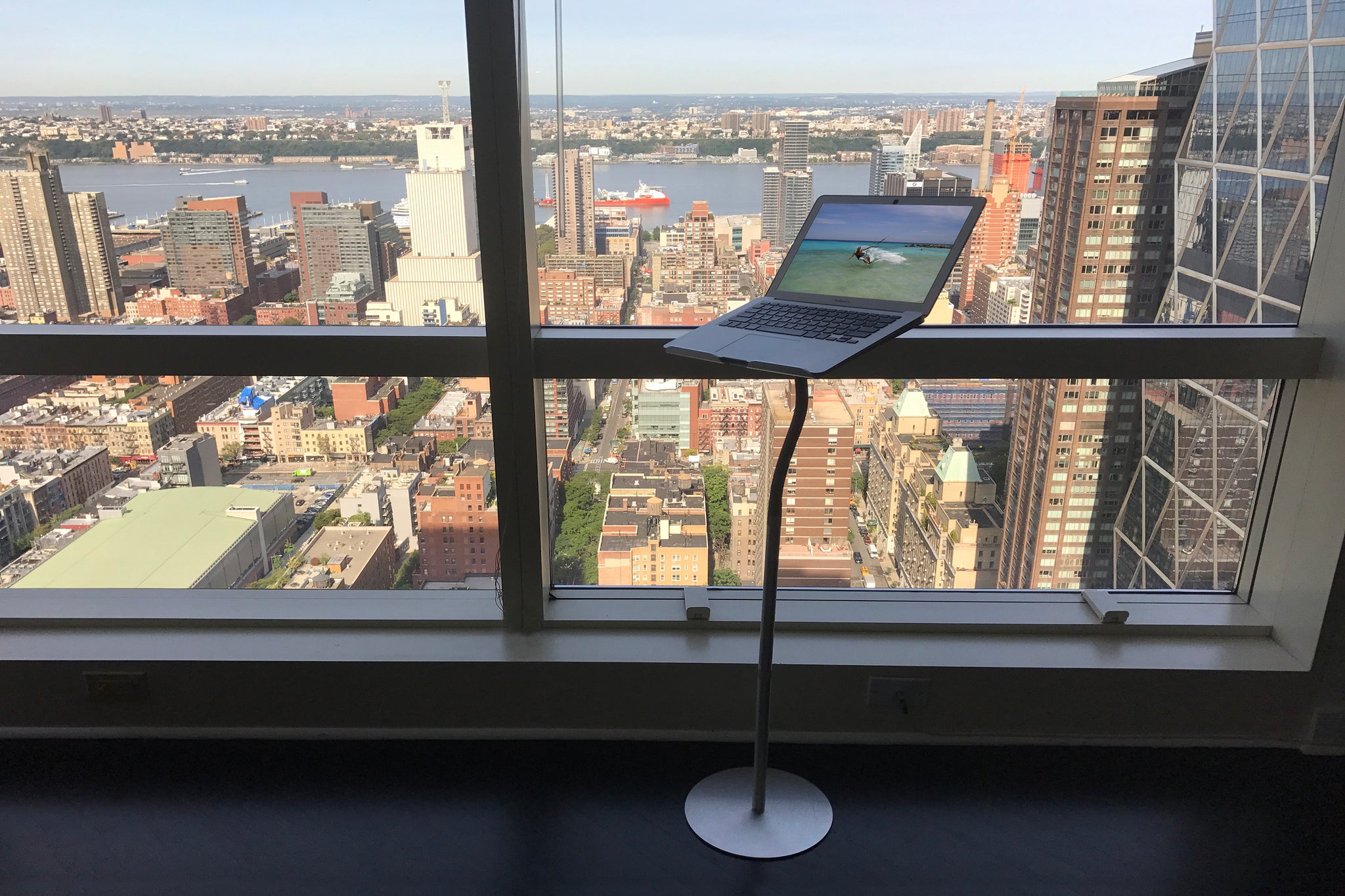 CAPTAIN is a sleek laptop floor stand and a portable standing desk. It's perfect for a diversity of work spaces and for keeping the blood flowing in the office, kitchen, or on the road. It features a stylish aluminum base and gooseneck with bracket that adjusts both vertically and horizontally at the perfect angle providing the best ergonomic experience. A popular laptop stand for maximizing your laptop while laying in bed and provides excellent support and comfort. The height of this tablet holder is adjustable between 6" and 36" and can be used on literally any floor surface.
